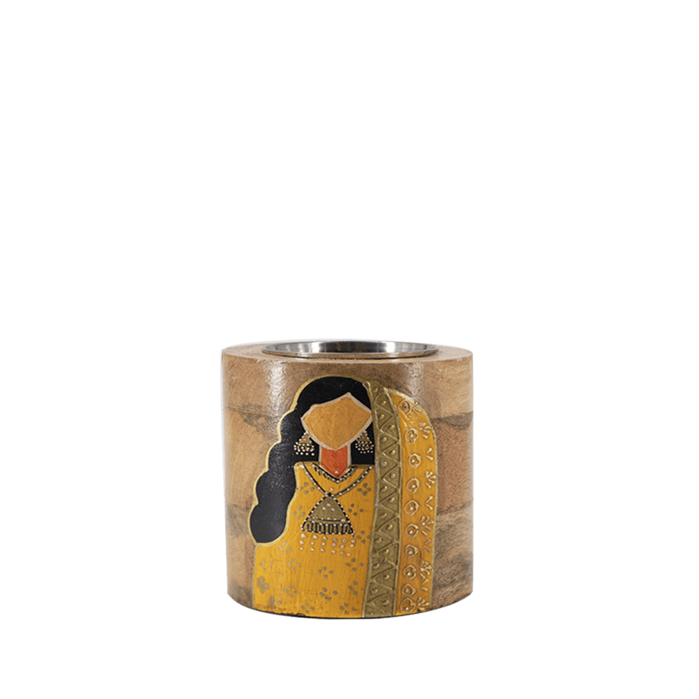 مبخرة خشبية بنقوش هندية صغيرة تتميز المبخرة بتصميمها الأسطواني الأنيق وزخارفها المستوحاة من المظاهر الهندية باللون الاصفر.
