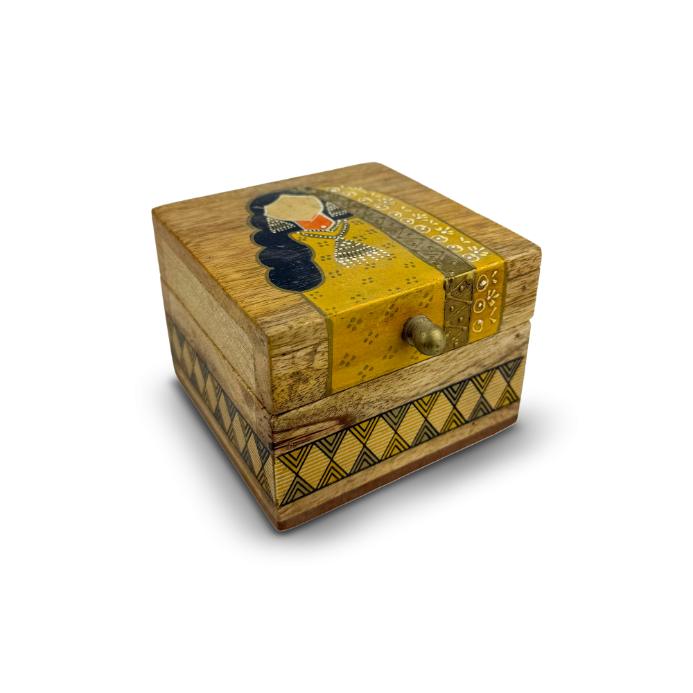 تتميز هذه الحافظة الخشبية المربعة بتصميمها الفني المبهج، مع رسومات بطابع يدوي ولون أصفر مشرق يضفي حيوية على المكان. تصميمها عملي جداً، ذات مقبض معدني، مما يجعلها مثالية لحفظ أعواد الند، أو كميات صغيرة من البخور، أو حتى للاستخدام كصندوق أنيق للمقتنيات الصغيرة.