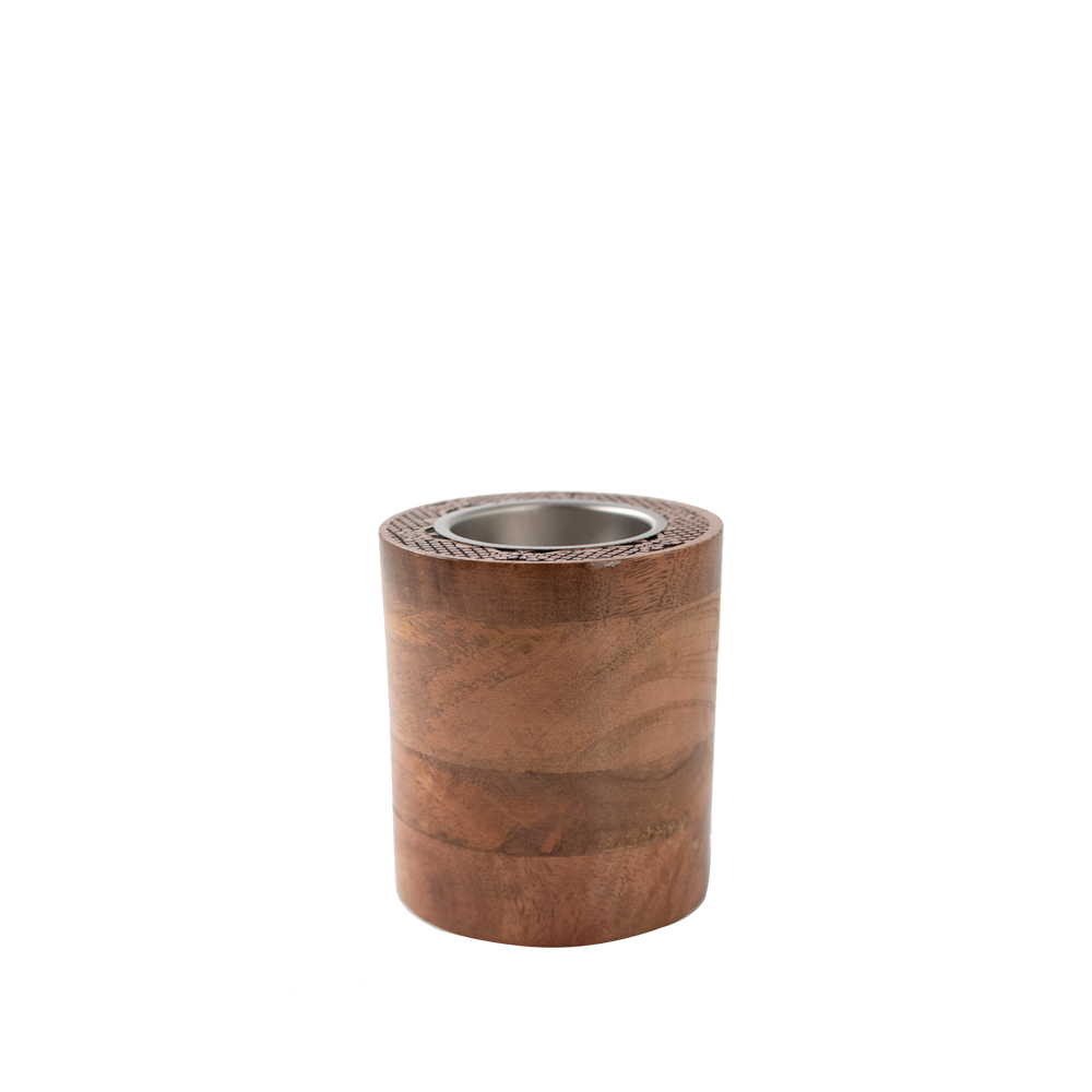 • Cylindrical incense burner (small): Made of high-quality wood and decorated with beautiful geometric engravings on two sections of wood and metal, giving it a unique and aesthetic appearance.